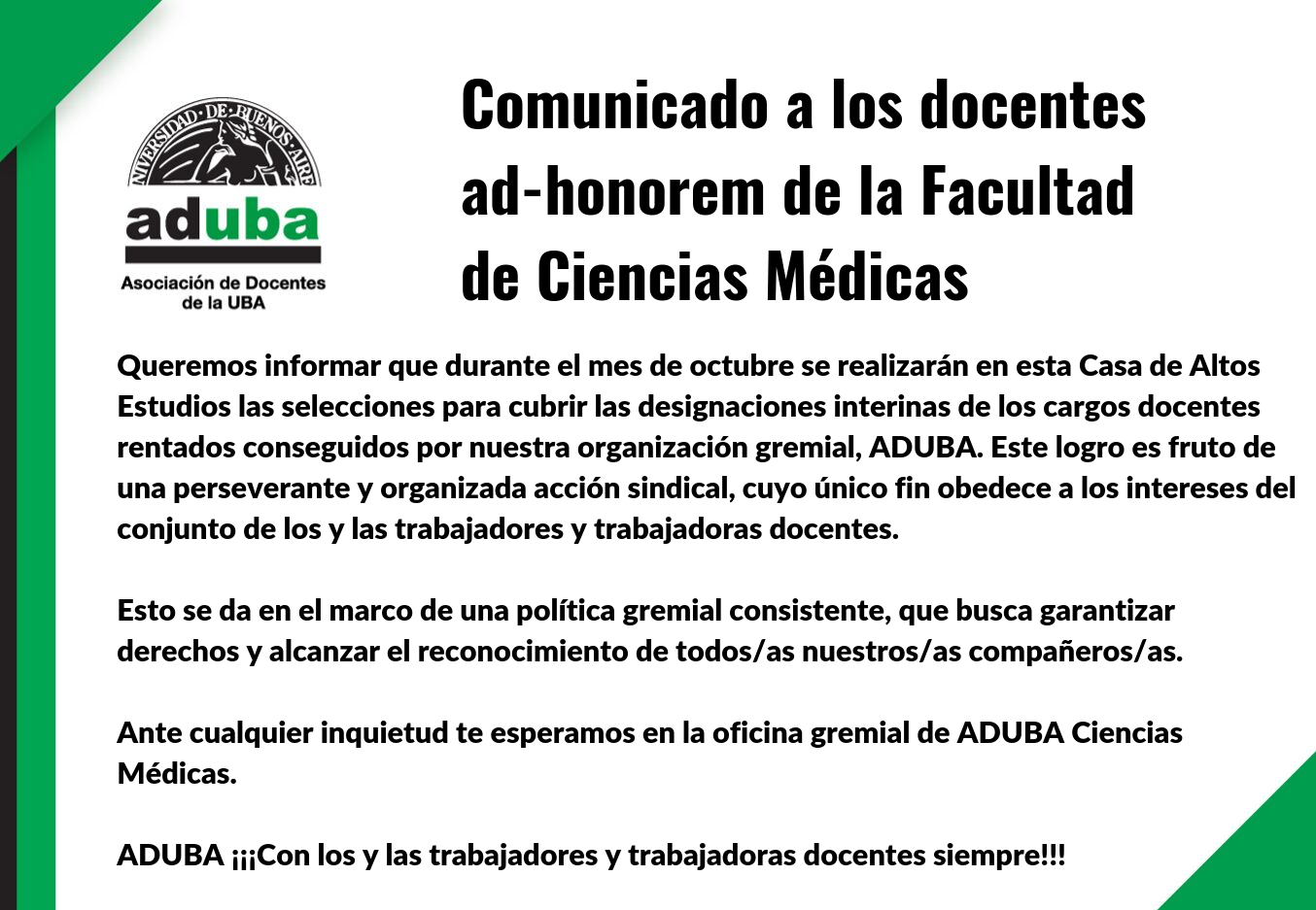 Comunicado sobre las designaciones interinas de los cargos docentes rentados conseguidos por nuestra organización gremial, ADUBA, que se realizarán durante el mes de octubre en