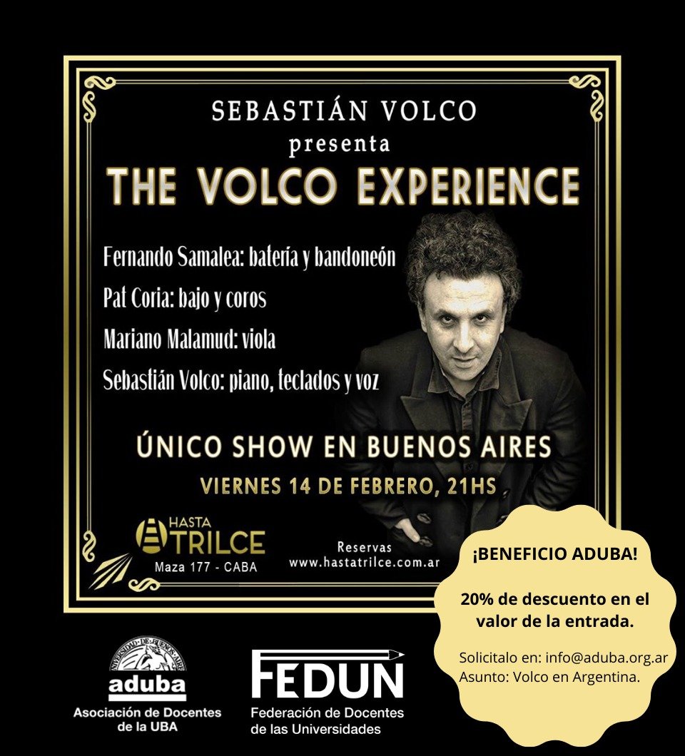 En el marco de las políticas de apoyo y difusión de actividades artísticas y culturales, te invitamos a asistir al concierto que dará en Buenos Aires el gran compositor y multi-instrumentalista Sebastián Volco, en el que presentará su último trabajo, “The Volco Experience”, el próximo viernes 14 de febrero en el teatro Hasta Trilce.